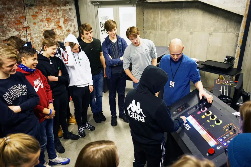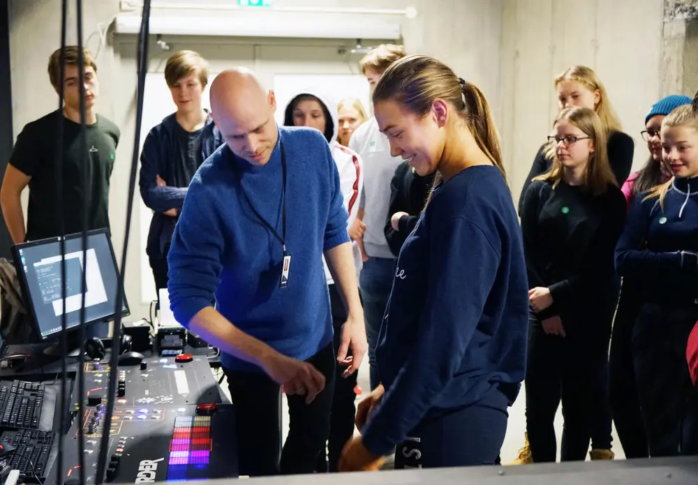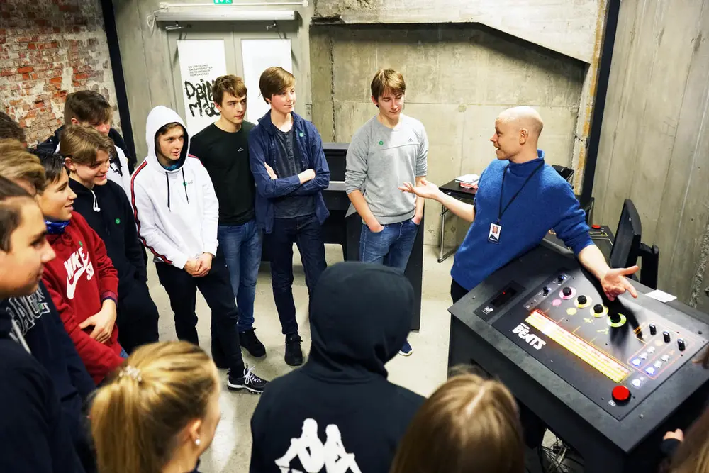 Elever fra Lade skole får prøve seg på Lydlab, ved hjelp av museumspedagog Sigmund Vegge. Alle foto: Rockheim.