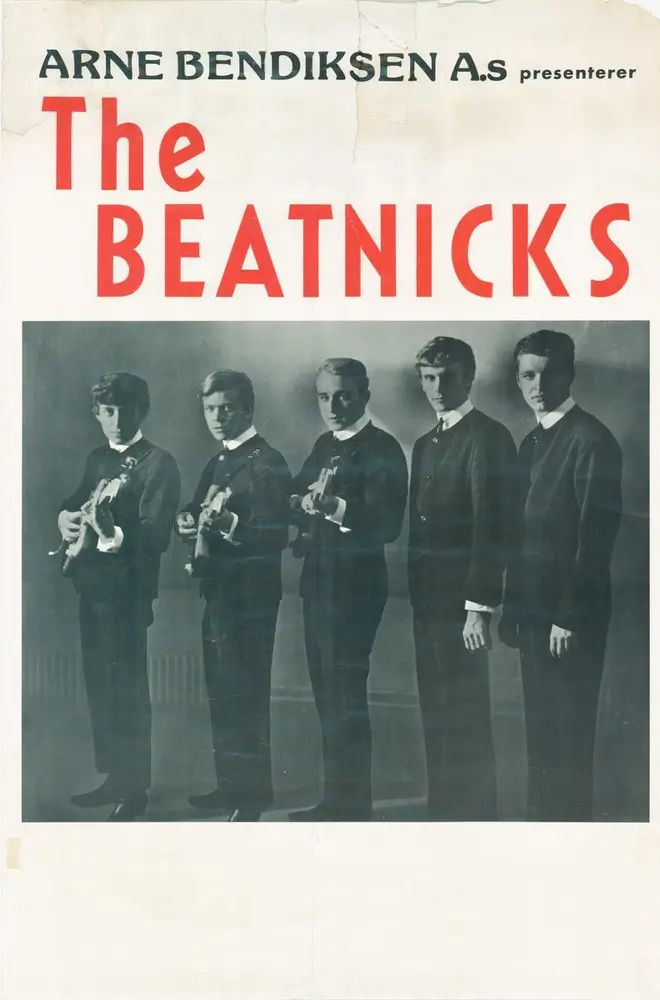 The Beatnicks anno 1964. Frå venstre: Svein Finjarn, Oddvar Gundersen, Carsten Deberitz, Truls Lorck og Kåre Haugen. Plakaten er produsert av Arne Bendiksen A/S (Triola), som i den tida var plateselskapet til bandet. Den blei donert til Rockheim av Beatnicks-gitarist Svein Finjarn (f. 1946) i 2008. Fotografen er inntil vidare ukjent. Men fotoet ser ut til å vere tatt i Malerhaugveien på Etterstad, der selskapet hadde kontor og lydstudio. Trykkeriet er, ifylgje Tore Bendiksen, Sekkelsten.