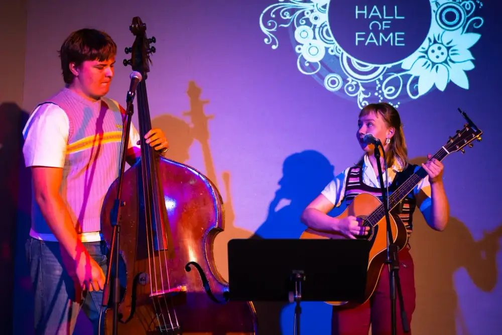 Fra åpningen av Rockheim Hall of Fame-utstillingen hvor artist Ragnhild Risnes og Tarald Kongshaug var de første som spilte på scenen i rommet. Foto: Rockheim