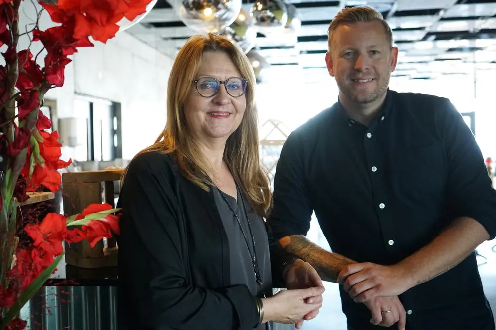 Sissel Guttormsen (direktør, Rockheim) og Daniel Johansson (daglig leder, Lille Skansen) med Rockheim Panorama i bakgrunnen. Foto: Rockheim
