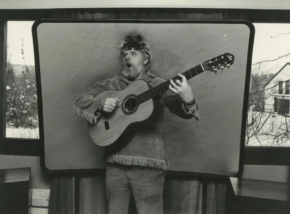 Arne Bendiksen i sitt ikoniske Davy Crockett-antrekk. Komplett kostyme, inkludert børse, er blant ingrediensene i utstillingen En blå ballong.