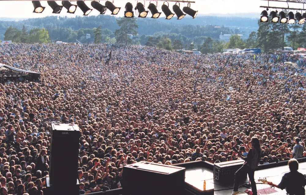 Dette er Neil Young på Kalvøya i 1993, sammen med Booker G. & The MG´s. En legendarisk konsert. Foto: Wiggo Schie Fotoet blir en del av utstillingen på Rockheim.