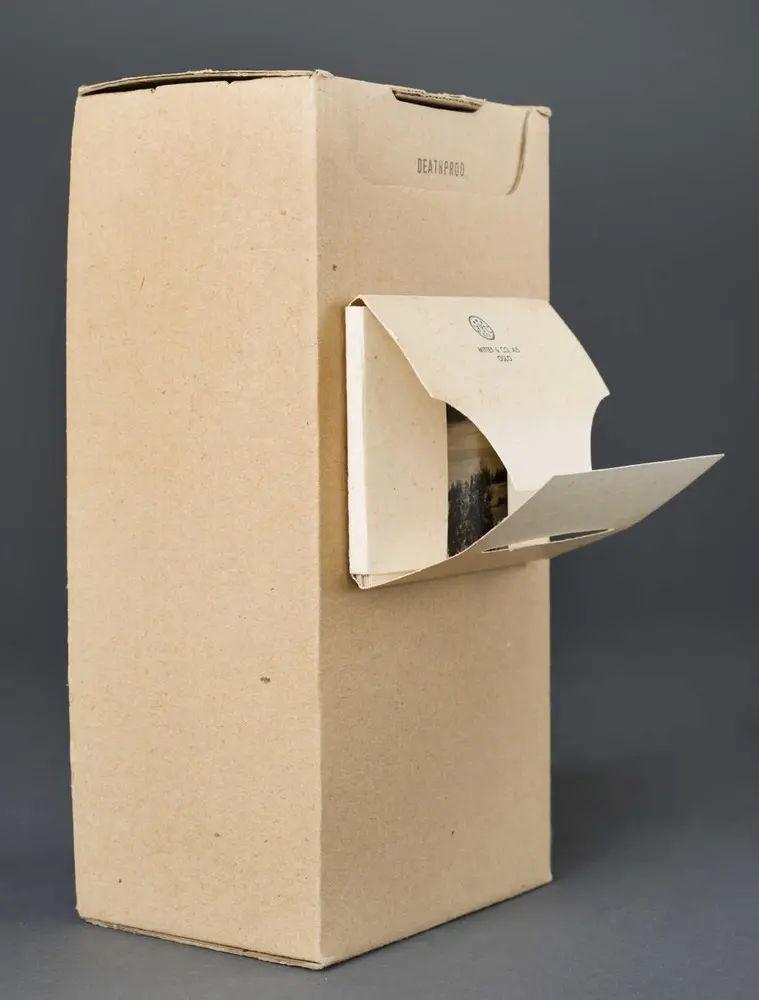 Kompaktkassetten med plastcover står inne i ei pappeske. Når du opnar eska, opnar også kassettetuiet automatisk. ”Jeg valgte boksen fordi jeg kunne lage en mekanisme som åpnet kassettetuiet samtidig som man åpnet lokket i boksen”.3