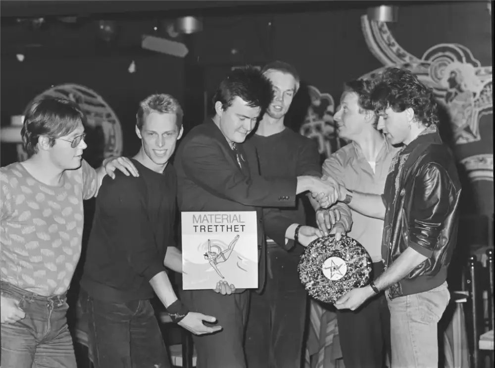 The Aller Værste! lanserer sitt første album «Materialtretthet» gitt ut på deres eget selskap «Den gode hensikt» høsten 1980. I et pek mot den etablerte platebransjen deler manager Lars Lauritzen ut selvlaget diamantplate for 150 solgte. De brukte ellers pressekonferansen til å argumentere for fordelene ved å stå utenfor bransjen og å ha kontrollen selv. Foto: Kåre Eide