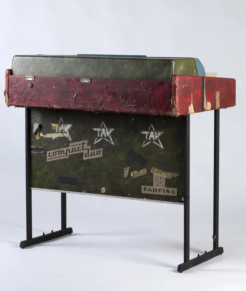 Farfisaen er av merket Compact Duo. Orgelet bærer preg av hardt turneliv og har på grunn av materialtretthet (?) nok dessverre spilt sine siste toner. Før det ble tilbudt Rockheim, hadde instrumentet i mange år stått på et loft i Bergen. Foto: Uta Freia Beer/Rockheim