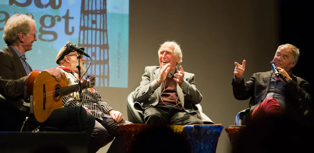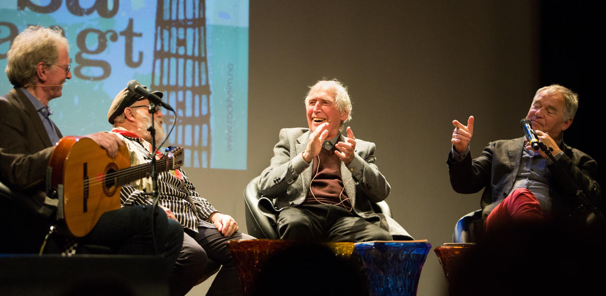 Øystein Sunde (fv), Sid Jansson, Alf Cranner og Lars Klevstrand på Rockheim scene i 2017, i forbindelse med utstillingen Ei vise er så mangt. Foto: Elise Maalø.