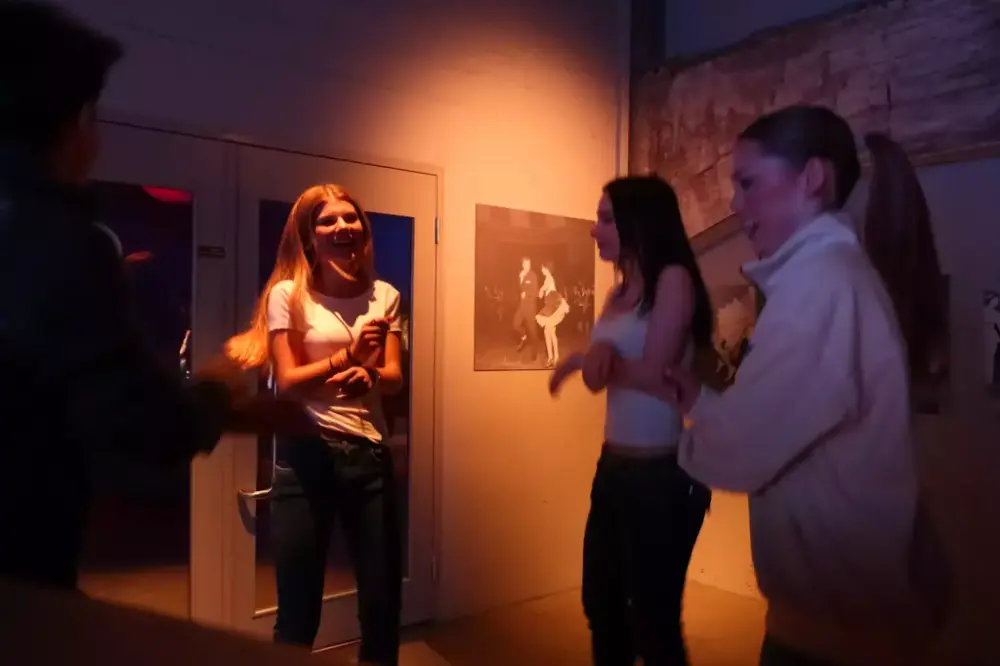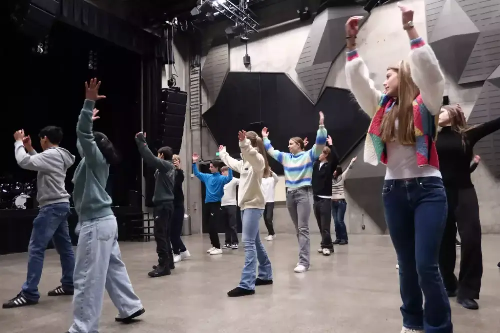 Elever ved Selsbakk ungdomsskole lærer koreografi av Rockheims formidlere.
