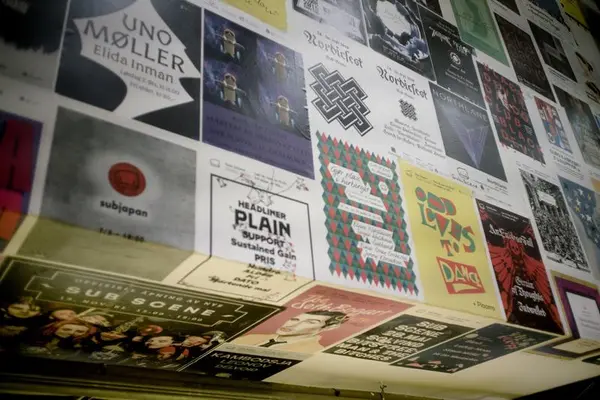Trappen ned til kjelleren i Sub er tapetsert med konsertplakater fra Sub Scene. Foto: Rockheim/Marthe Amanda Vannebo.