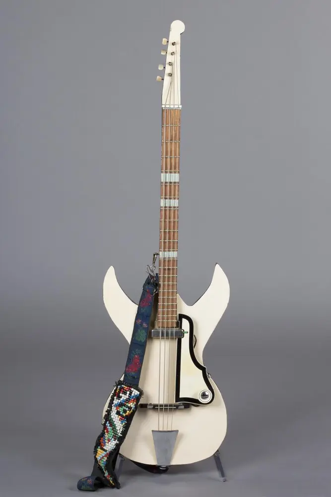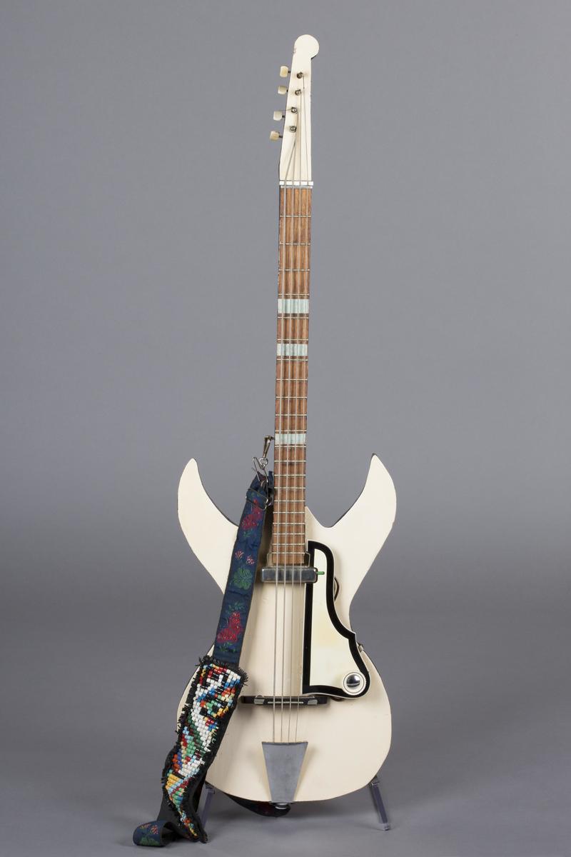 Den såkalte Wangberg-bassen, bygd av Eirik Wangberg (The Cool Cats) i Henki Kolstads garasje året 1959. Jet Harris fra The Shadows prøvespilte den da The Cool Cats var i London i 1960. Bassen er en av tre "sløydgitarer" du kan se utstilt på Rockheim. Foto: Uta Freia Beer/Rockheim