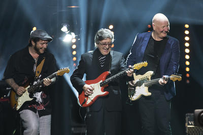 Svein Finjarn (i midten) flankert av Vidar Busk (fv.) og Frode Alnæs under Rockheim Hall of Fame-seremonien i 2016. Foto: Geir Mogen/Rockheim.