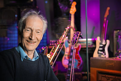 Trond Graff i utstillingen Rockens verktøy på Rockheim. Helt til høyre står hans Stratocaster fra 1962. Foto: Geir Mogen/Rockheim. - 2/2