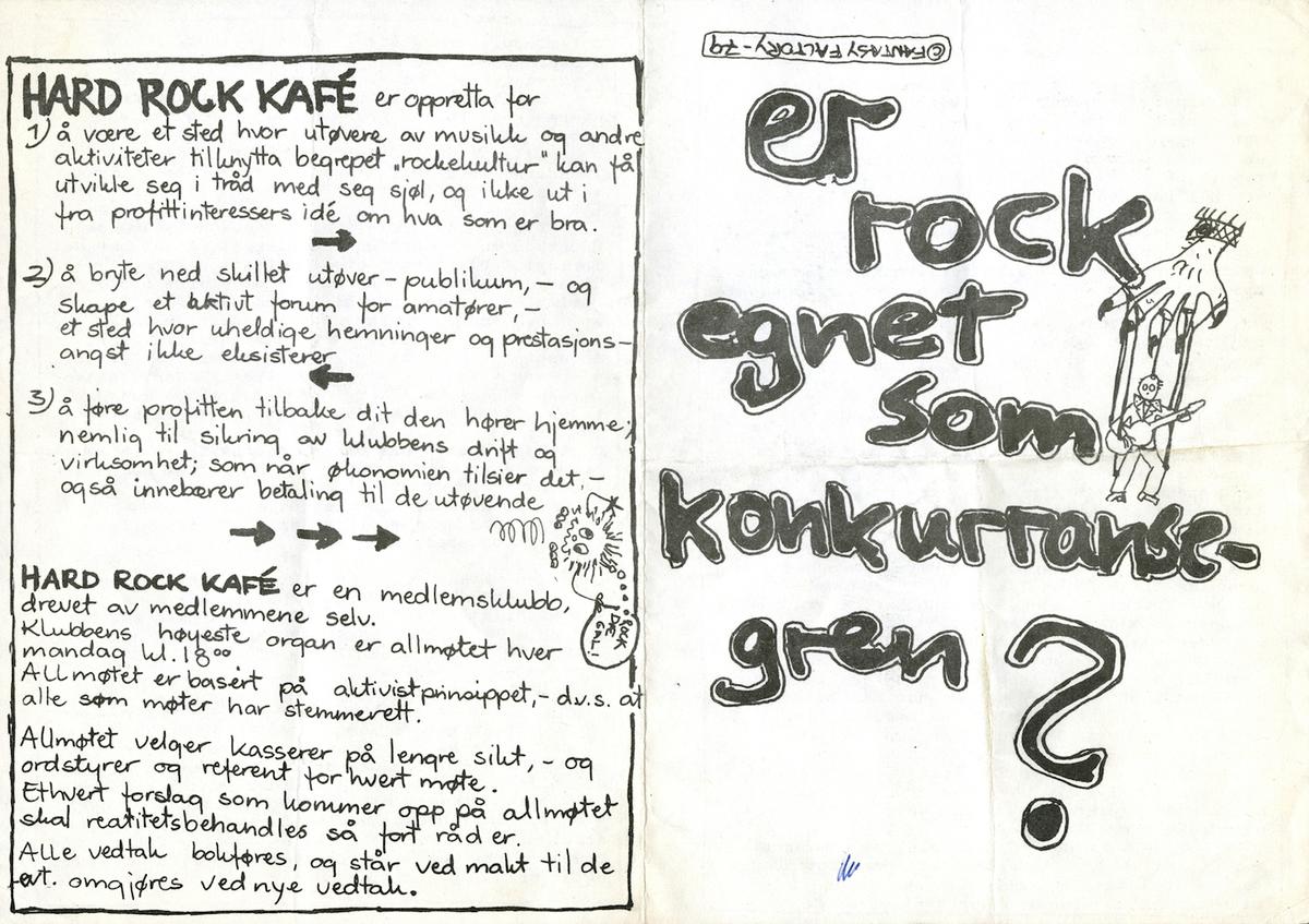 Løpeseddel/brosjyre og programerklæring fra Hard Rock Kafé 1979.