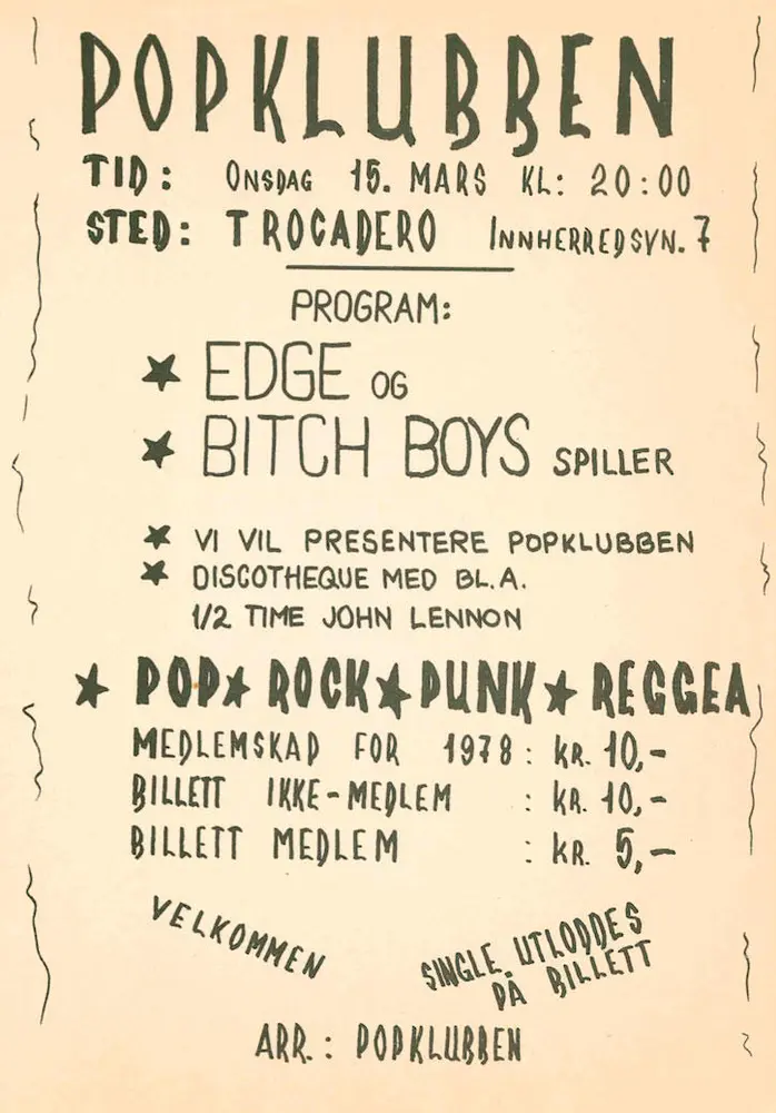 Plakaten viser at både inngang og medlemspris var svært rimelig, selv omregnet fra kroneverdiene i 1978. Navnet ”Popklubben” spilte på det arrangørene oppfattet som Trondheims forrige storhetstidsted for pop og rock, nemlig Popclubben på Studentersamfundet på 1960-tallet. Stedet, Trocadero, var en kafé spesielt brukt av arbeidere ved Trondheims Mekaniske Verksted, men hadde også scene som særlig ble brukt til gammeldans. Åpningsplakaten reklamerer dessuten med diskotek hvor John Lennon blir nevnt spesielt, altså en artist fra forrige tiår som på det tidspunktet hadde erklært at han hadde trukket seg fra popbransjen for å prioritere familien. Også ideen med utlodning av single-plate var hentet fra sekstitallet, og et minne om lokale ”tenåringstreff” som de nye konsertarrangørene akkurat ikke hadde vært gamle nok til å få komme inn på. Så mye for bruddet med fortida, og modernitetens død.