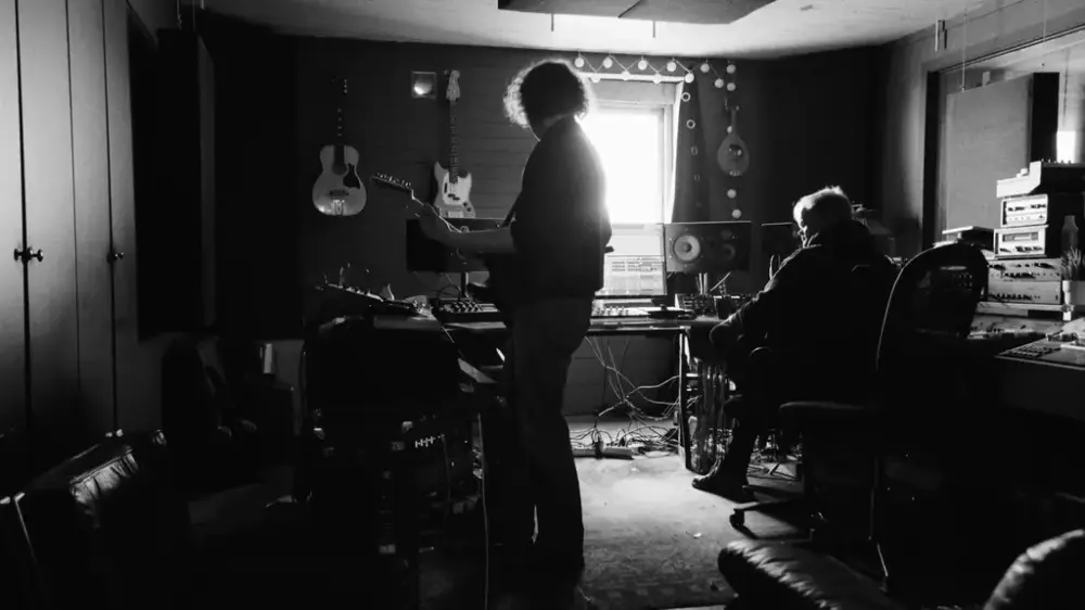 Mathias Angelhus improviserer på gitar mens makker Åsmund Arnesson Rise tar opp. Musikken endte opp med å bli utstillingens lydspor, Foto: Carl Christian Lein Størmer
